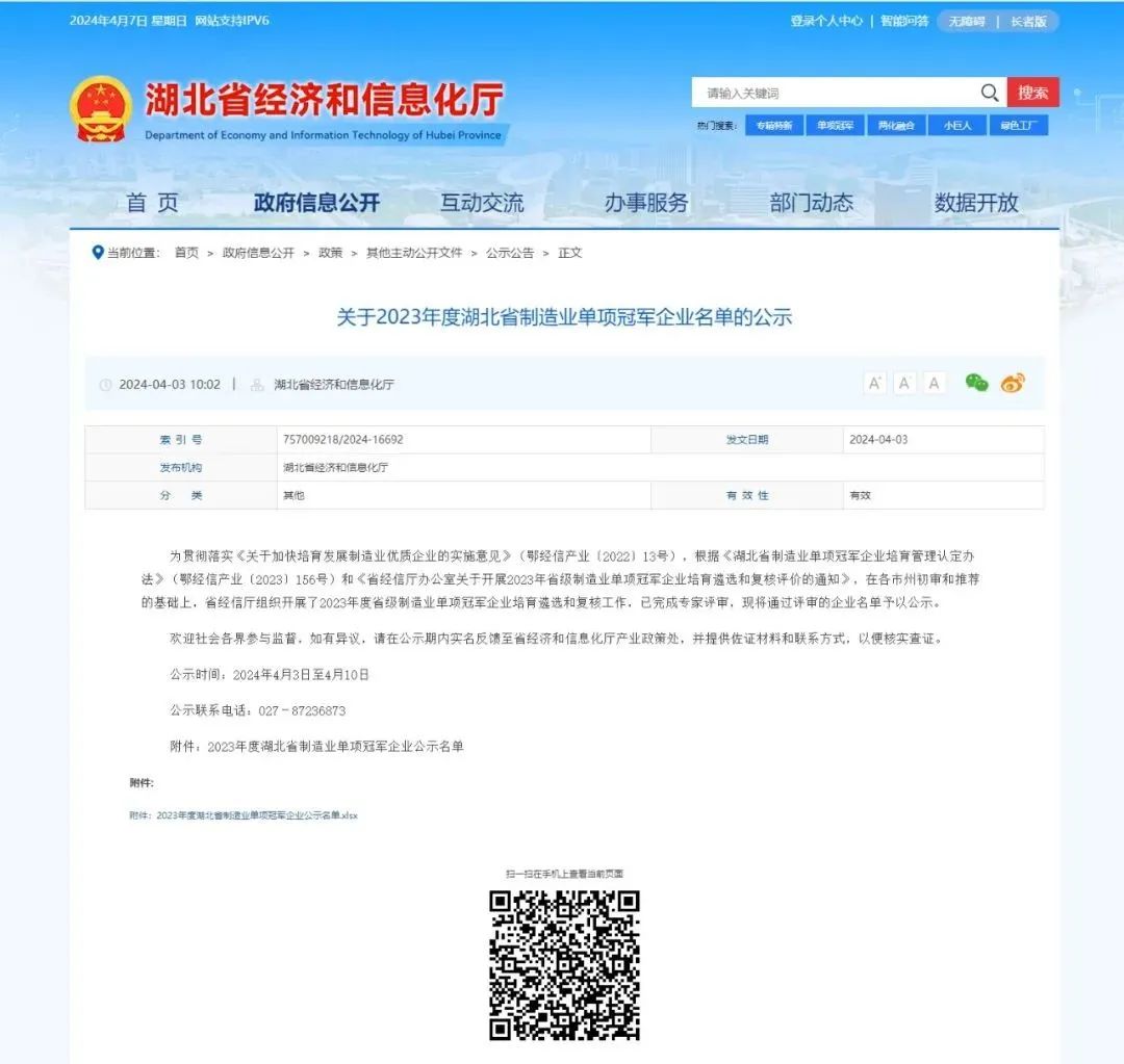近日,湖北省經濟和信息化廳公示了“2023年度湖北省制造業單項冠軍企業”名單。