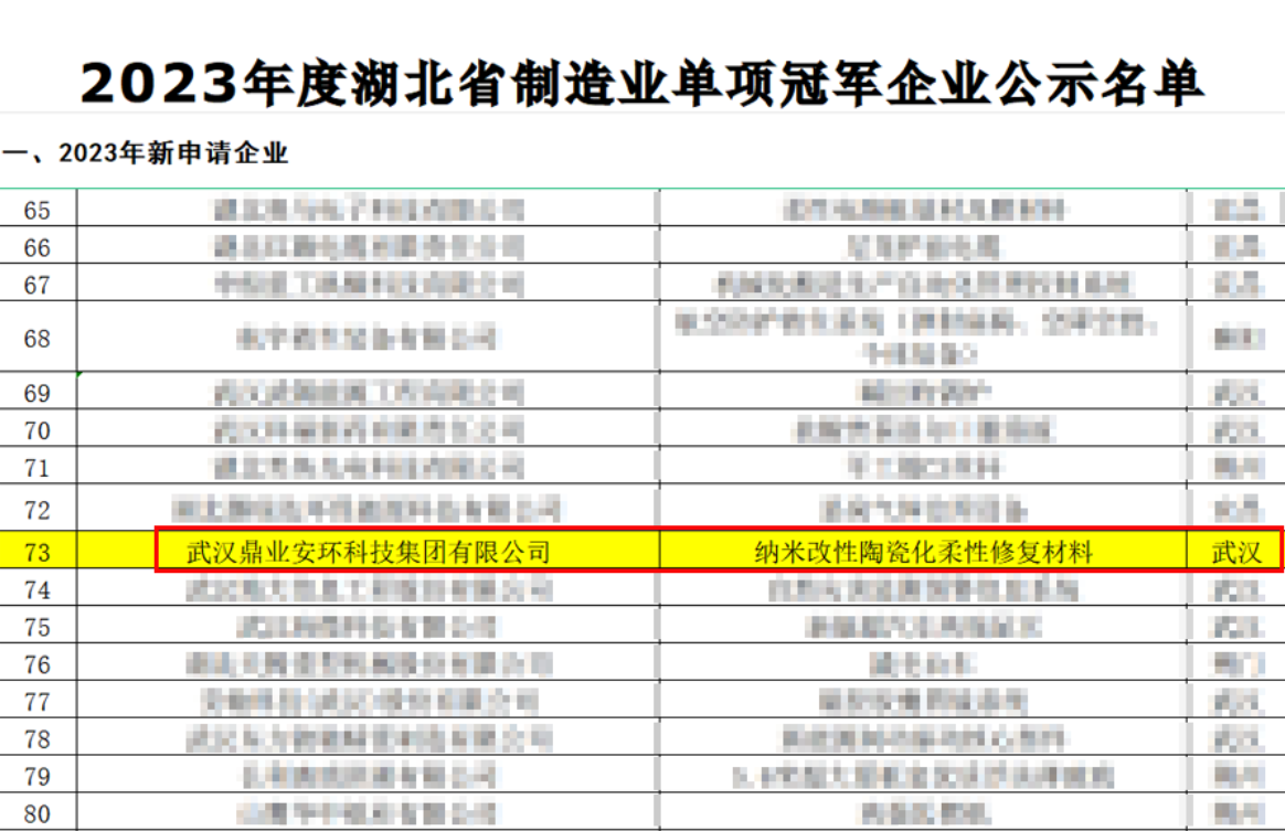 武漢鼎業安環科技集團有限公司(序號73)通過遴選和復核,以“納米改性陶瓷化柔性修復材料”產品,入選2023年度“湖北省省級制造業單項冠軍企業”名單。