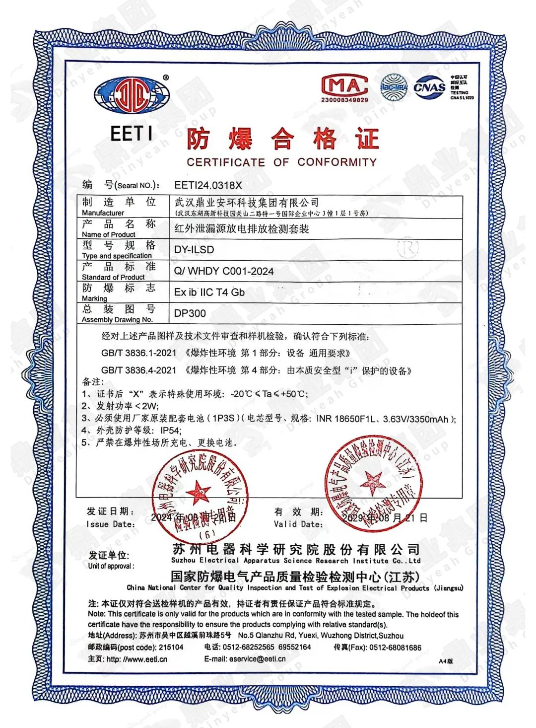 近日,由武漢鼎業(yè)安環(huán)科技集團(tuán)有限公司自主研發(fā)的“紅外泄漏源放電排放檢測套裝”,經(jīng)過國家防爆電氣產(chǎn)品質(zhì)量檢驗檢測中心審查,確定設(shè)備符合防爆標(biāo)準(zhǔn)的要求,具有極高的安全性和可靠性,可用于各種易燃易爆場所安全工作,現(xiàn)已順利取得防爆合格證。