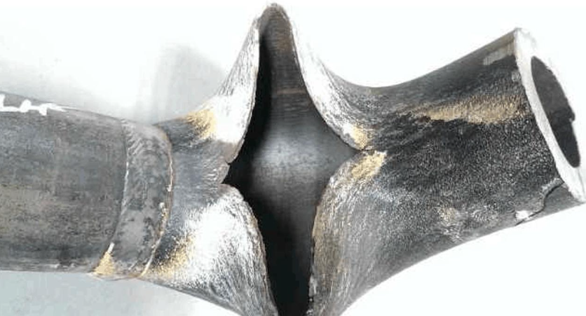 1.超溫過熱:短期超溫過熱是管壁溫度超材料下臨界溫度,強度下降后在內壓作用下脹粗爆管,特征為管徑脹粗、管壁減薄呈刀刃狀、爆口大且周圍硬度高;長期超溫過熱是管壁溫度長期超設計溫度,力學性能惡化后脆裂,特征為管徑無明顯變化、爆口小呈顆粒狀且周圍有氧化皮。